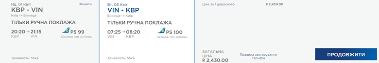 Ціна квитків з Києва до Вінниці і назад за тарифом «тільки ручна поклажа» на даний момент становить близько 2430 грн (еквівалент €73) з урахуванням зборів.