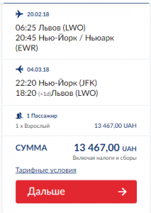 Львів – Нью-Йорк, 20 лютого – 4 березня: 408 євро (ручна кладь — 8 кг + багаж – 2 х 23 кг).