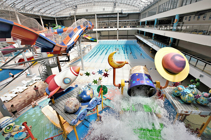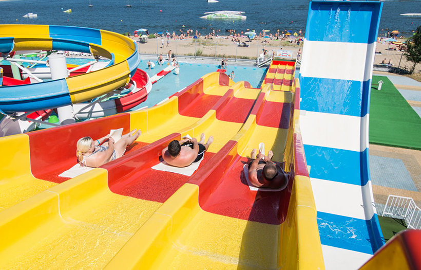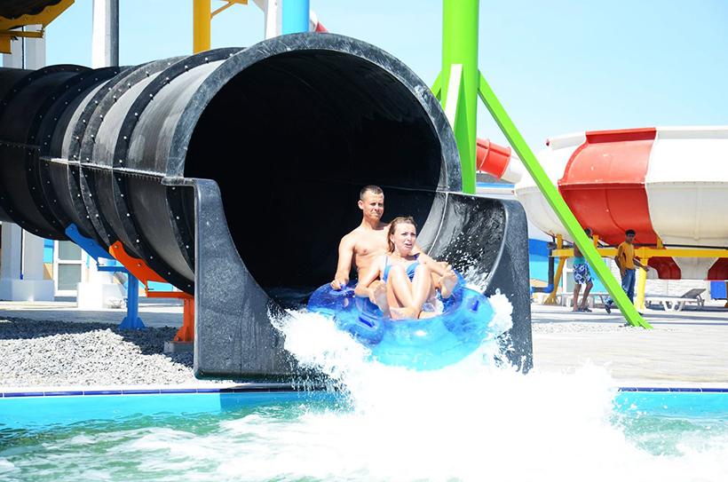 Гости могут спустить с высоты 9-этажного здания. А после расслабиться в релакс-зоне, поплавать в бассейне с противотоками, посидеть в баре или попариться в банях. С детьми работают аниматоры. Также для самых маленьких гостей есть специальные горки.