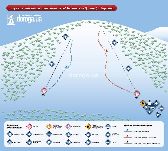 Горнолыжный центр “Альпийская долина” с системой искусственного оснежения склонов находится в 15 км от Харькова. Сезон катания здесь начинается в декабре и заканчивается в конце марта. Основан в 2003 году. Главное достоинство этого центра – наличие снеговых пушек. После нескольких морозных дней быстро достигается достаточный снеговой покров для катания. Есть 2 трассы – протяженность по 400 м. Перепад высот – 65 м, ширина – 20-40 м. Имеются 2 бугельных подъемника.