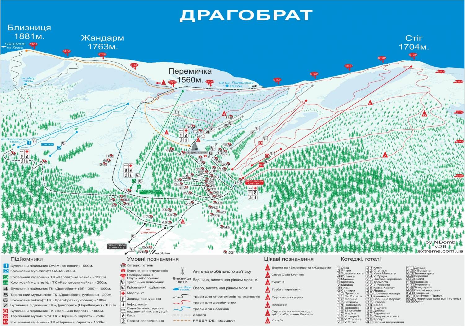 Популярность его обуславливается высотами, на которых обустроены трассы. В силу природных условий и грамотно созданной инфраструктуры Драгобрат является наиболее высокогорным курортом страны (минимальные высоты начинаются от 1400 метров, наивысшие – на вершине горы Стог, 1707 метров). Всего на курорте 20 трасс, длиной от 300 до 2000 метров. Общая длина трасс – более 10 километров. Неудобство в том, что подъёмники принадлежат разным владельцам, поэтому единой цены на них нет. Но плюс в том, что одиночные спуски стоят не дорого – от 10 грн за подъем.