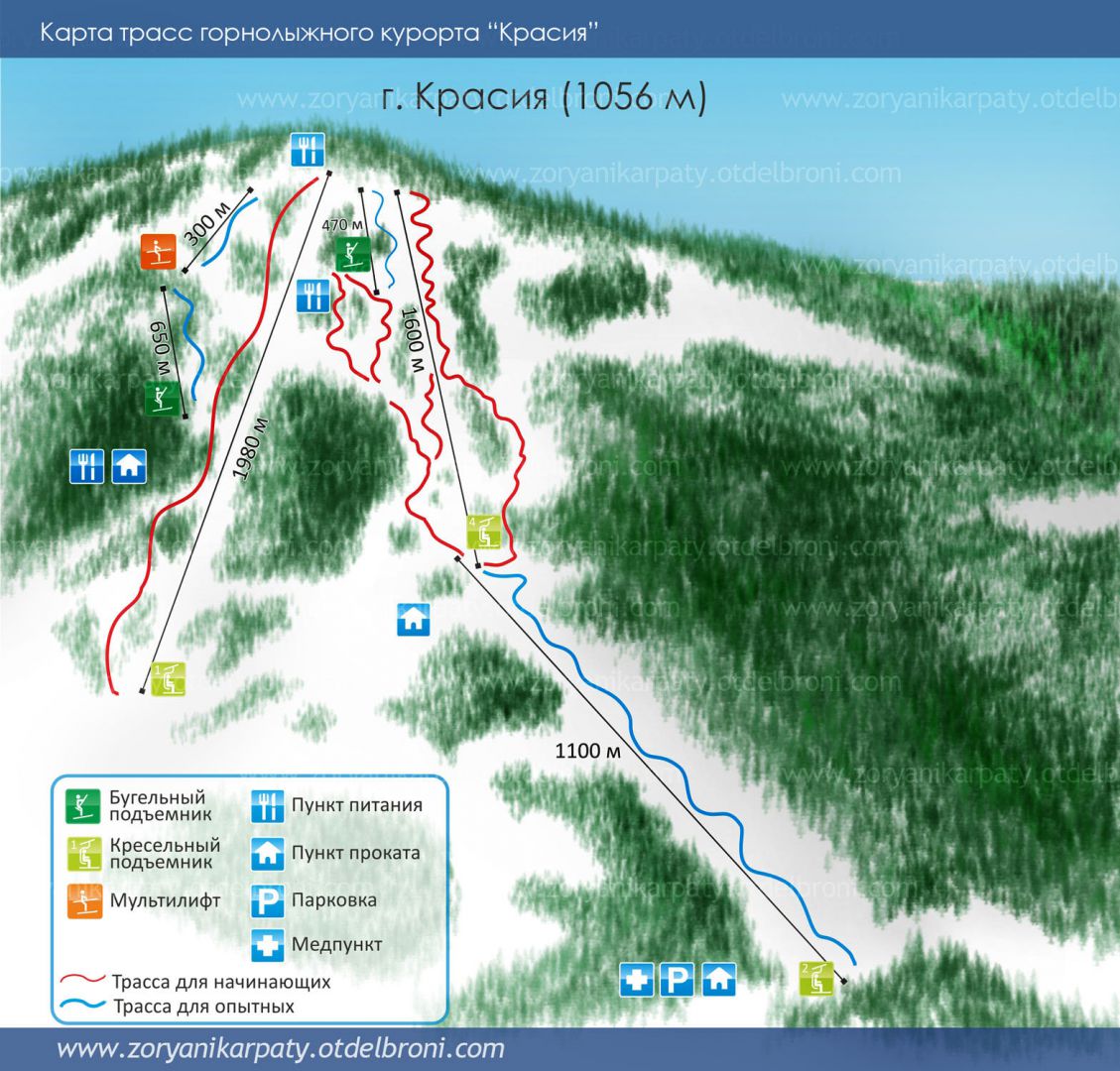 - бугельний ГК «Красия» — 470 м, перепад высот 95 м