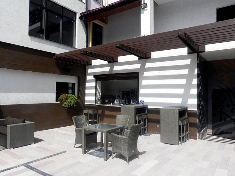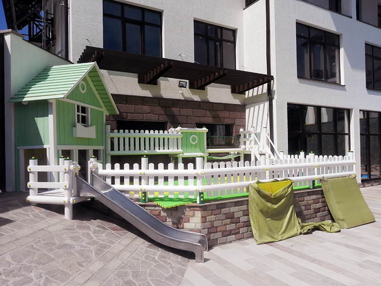 Поруч з основним басейном є також невеликий басейн-джакузі, дитячий майданчик та бар із прохолодними напоями.