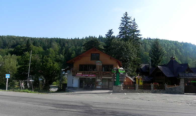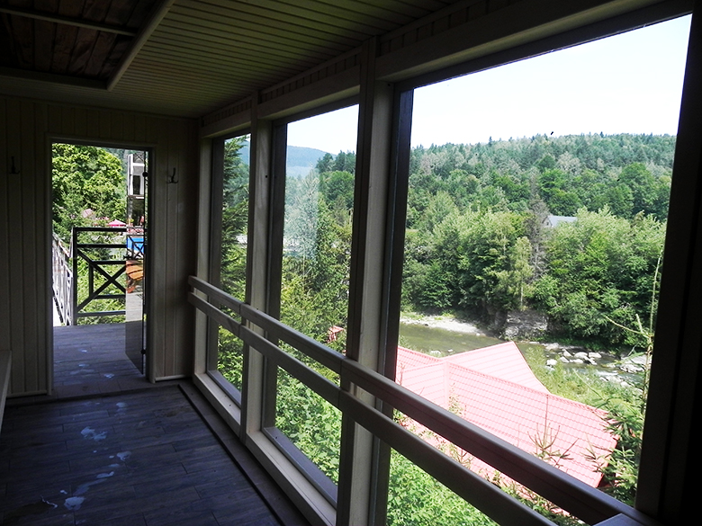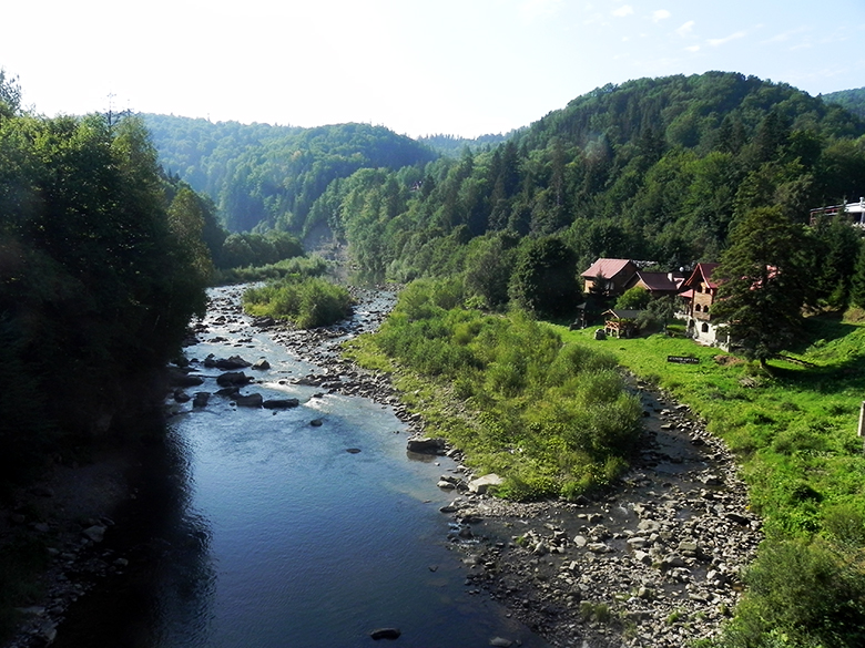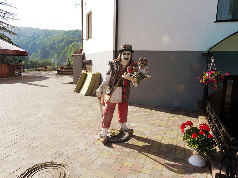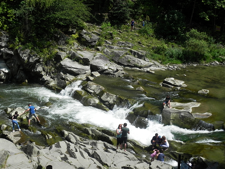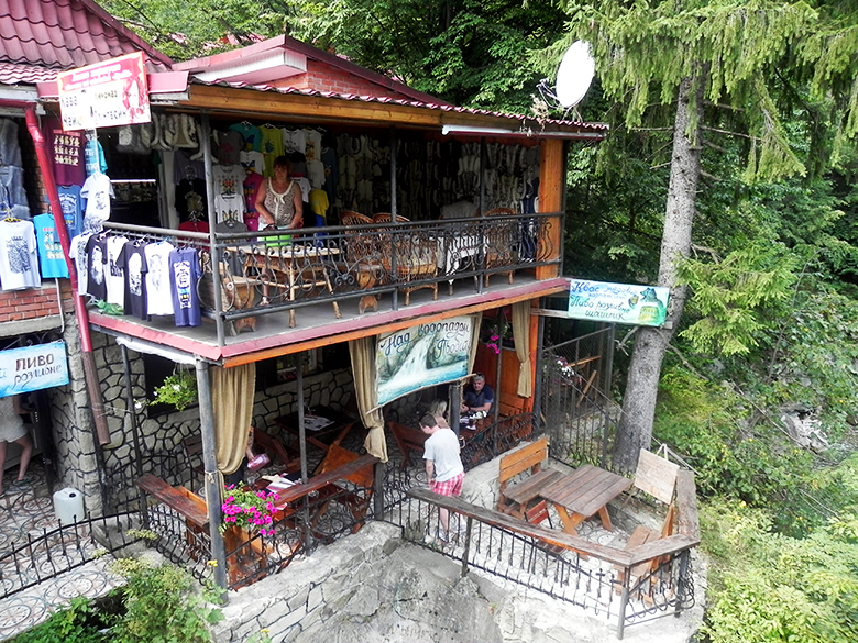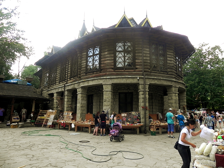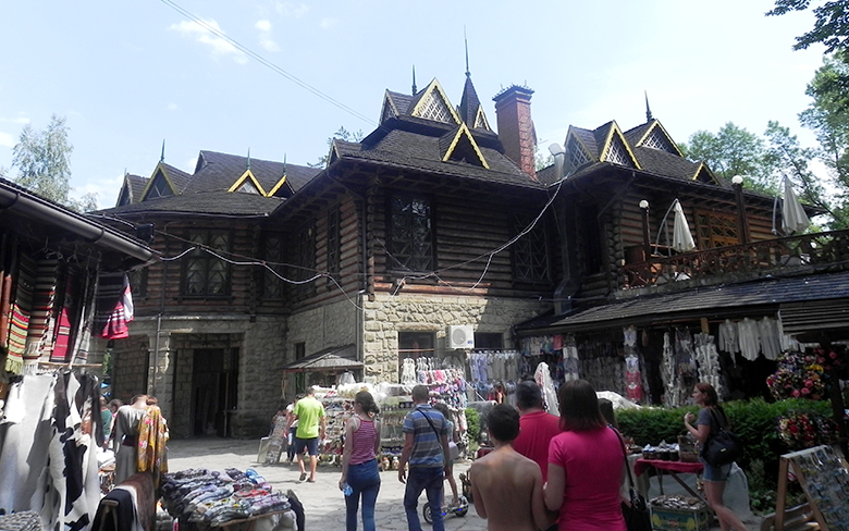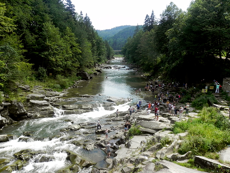 Ми милувалися бурхливою річкою, а, перейшовши через неї – пам’яткою архітектури – рестораном «Гуцульщина», який було збудовано в 50-х роках ХХ століття без жодного цвяха. Навколо ресторану та поруч завжди йде жвава торгівля.