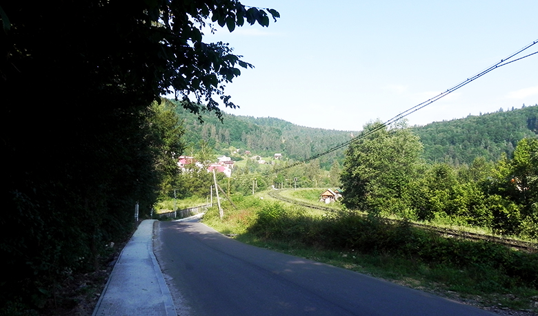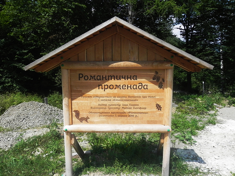 У нас ще лишалася година до відправлення, яку ми провели в кафе взявши собі смачні безалкогольні коктейлі Мохіто. Маршрутка відправилася за розкладом і вже о 9 ранку ми були на потрібній зупинці «На пеньках» – про неї я дізнався у людей з якими їхав поруч, коли запитав, з якої зупинки найближче йти до нашого готелю. Щодо самої дороги, то вона в міру комфортна: не німецький автобан, але й сльози на очі не навертаються від її якості. Коли вийшли з маршрутки, то навпроти побачили доказ правильності шляху – вивіску «На пеньках».