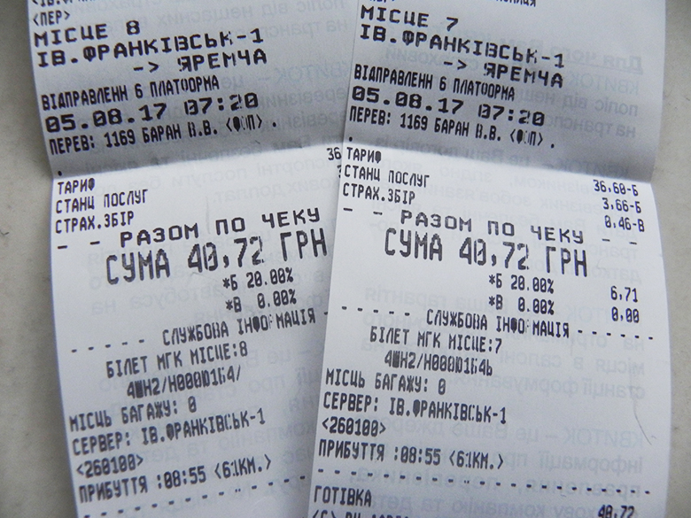 Доїхати із Івано-Франківська до Яремче можна маршрутками, на таксі або замовити трансфер в готелі. Ми вирішили поїхати маршруткою. І тут також є різноманіття: їхати маршруткою прямо від залізничного вокзалу за 100 грн., чи поїхати з автовокзалу, що знаходиться поряд. Попередньо подивившись ціни в інтернеті, я знав, що із автовокзалу маршрутка коштує в діапазоні 40-55 грн залежно від перевізника. На двох та у дві сторони – відчутна економія. Наші квитки на найближчий рейс із вільними місцями о 7:20 ранку вартували 40 грн та 72 копійки за кожен.