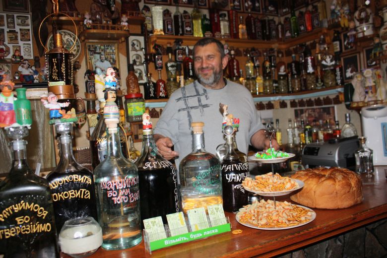 На полках и стойке бара вы не увидите ни одной бутылки со знакомым брендом зарубежного или украинского напитка. Все алкогольные предложения – настойки на основе местных ягод или целебных трав и по своим ароматом и вкусовыми качествами превосходят массовую продукцию известных фирм. Есть даже свой джин, настоянный на хвое .