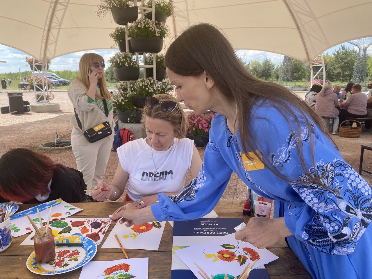 Програма зустрічі з мотиженцями передбачала не тільки роботу з землею. Ліцеїсти взяли участь у майстер-класі з петриківського розпису Наталії Підгірної-Бабин.