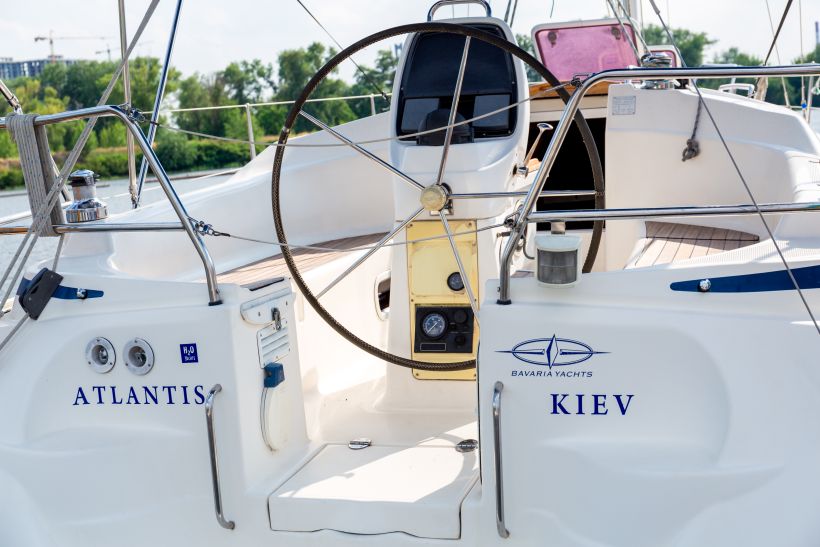 Від капітана дізнаємося, що наша 30-ти футова яхта виготовлена в Німеччині на відомій верфі Bavaria Yachtbau. Вона найменша зі своєї лінійки, але придатна для “дорослих” морських подорожей. Заглядаємо у люк дизельного мотора, і дивуємося, наскільки він чистий і невеликий. Все як на новому автомобілі, навіть пофарбований в світлий колір. На яхті є холодильник, газова плита, туалетного-душова кабіна з кумедною системою зливу. Всі шафи всередині яхти мають дверцята з фіксаторами, щоб під час качки з них не випадали посуд або продовольство. Те що на на яхті не “плавають” а ходять, ми вже знали, а ось те що яхтою не “рулять”, а стоять біля штурвалу – було для нас новиною.