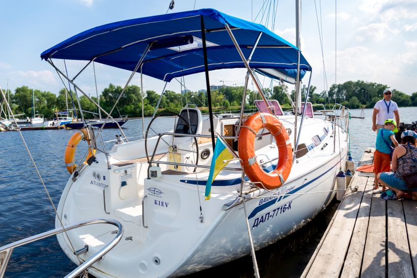 Від капітана дізнаємося, що наша 30-ти футова яхта виготовлена в Німеччині на відомій верфі Bavaria Yachtbau. Вона найменша зі своєї лінійки, але придатна для “дорослих” морських подорожей. Заглядаємо у люк дизельного мотора, і дивуємося, наскільки він чистий і невеликий. Все як на новому автомобілі, навіть пофарбований в світлий колір. На яхті є холодильник, газова плита, туалетного-душова кабіна з кумедною системою зливу. Всі шафи всередині яхти мають дверцята з фіксаторами, щоб під час качки з них не випадали посуд або продовольство. Те що на на яхті не “плавають” а ходять, ми вже знали, а ось те що яхтою не “рулять”, а стоять біля штурвалу – було для нас новиною.