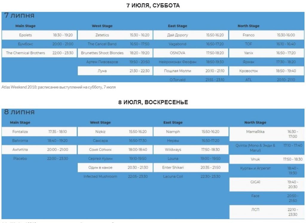 Главные события IV фестиваля Atlas Weekend разворачиваются в уикенд на ВДНХ. Именно тут в заключительные два дня мероприятия выступят легендарный DJ CARNAGE, The Chemical Brothers, Carnage, Бумбокс, O.Torvald, Луна, Пошлая Молли, ATL, Кровосток, Placebo, Lacuna Coil, Антитіла, Louna, Wildways, Bahroma, Один в Каное, ЛСП, Нервы и другие известные группы.