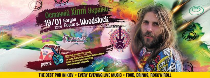 Талантливый и неординарный вокалист Богдана Совыка и его группа Woodstock представят на суд публики каверы на известные рок-композиции 60-70-х годов. В концертной программе«Последний хиппи Украины» вы услышите хиты таких легендарных групп как The Beatles, The Rolling Stones, Led Zeppelin, The AnimalsиThe Doors.