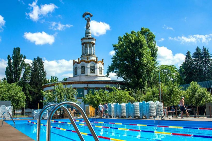 Несмотря на то, что Киев разделяет Днепр, многие боятся купаться в реке. Для них на Трухановом острове есть огромный бассейн глубиной 2 м. Здесь есть отдельный бассейн для детей с горками. Работают кафе и рестораны.