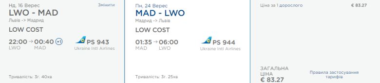 Львів – Мадрид 16-24 вересня – 83,27 евро