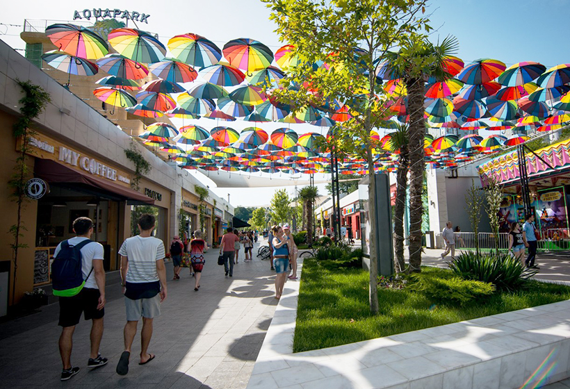 Рядом с отелем – Аркадийская аллея с кафе и ресторанами, магазинами, аттракционами, светомузыкальным фонтаном, аквапарком и иными развлечениями. Вечерами это территория для променада: и себя показать, и на других посмотреть.