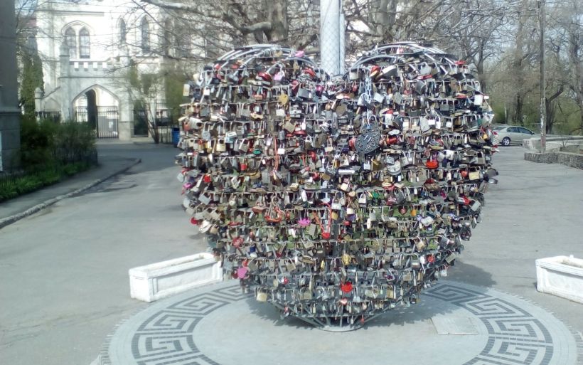 Рядом арт-объект «Влюбленное сердце». На него влюбленные вешают замочки со своими именами.