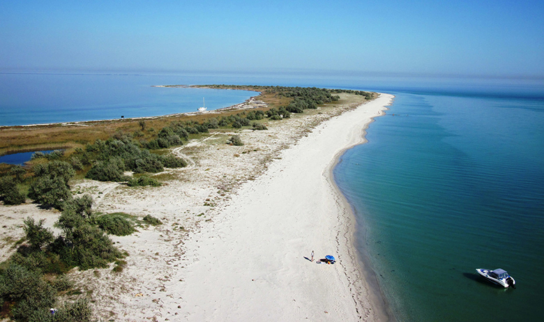 - Чтобы попасть на пляж, надо оказаться в Скадовске, откуда на остров бегают кораблики. Или перейти вброд через пролив от поселка Лазурное.