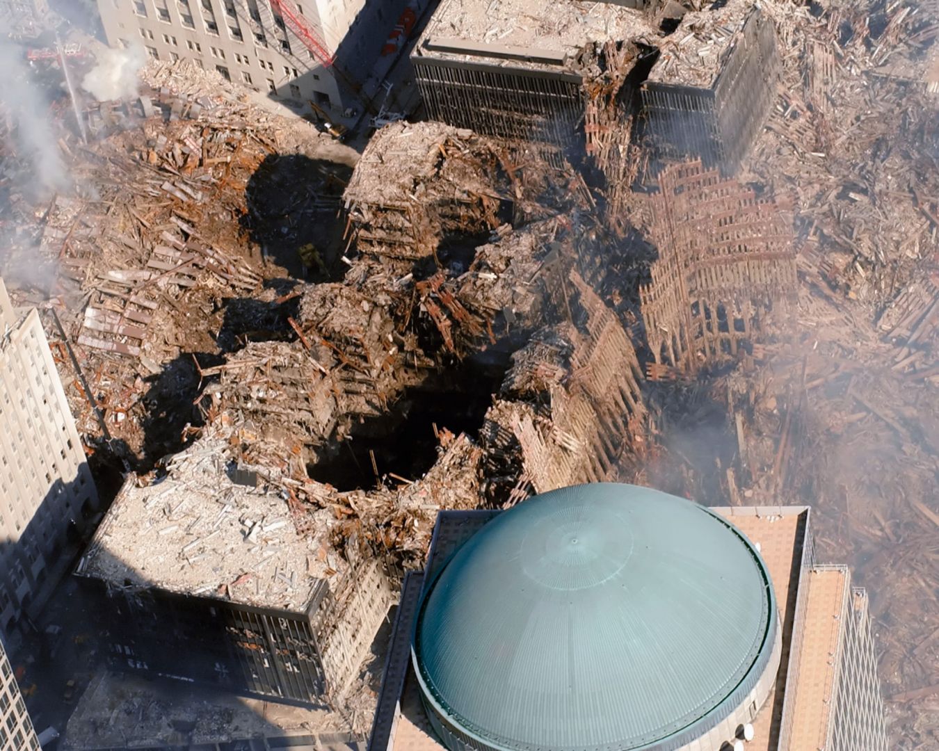 11 вересня 2001 року о 8:46 (за європейським часом) захоплений терористами пасажирський літак American Airlines врізався у північний фасад Північної вежі між 93-м і 99-м поверхами. Через сімнадцять хвилин, о 9:03 ранку (за європейським часом), друга група терористів спрямувала захоплений рейс United Airlines у південний фасад Південної вежі, вдаривши між 77-м і 85-м поверхами.