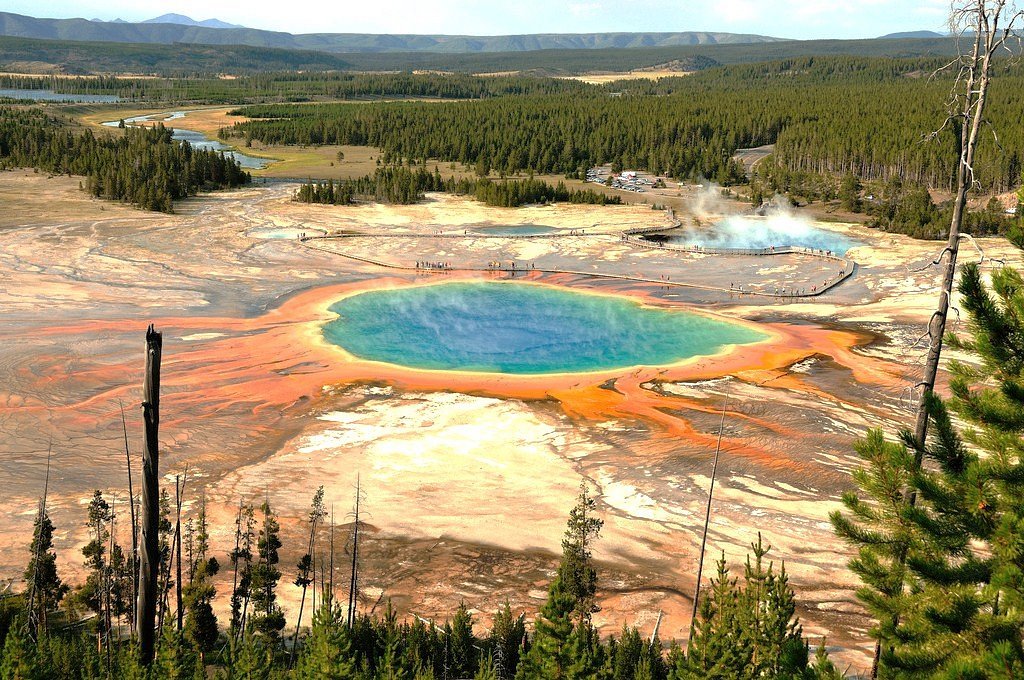 - Єллоустоун: Найстаріший національний парк у світі, створений в 1872 році. Відомий своїми гейзерами, гарячими джерелами, грязьовими котлами та дикою природою. Об’єкт Світової спадщини ЮНЕСКО. На фото один з об’єктів цього парку – Велике призматичне джерело — найбільше в США й третє за розміром у світі гаряче джерело. Його ще називають «Оком Землі».