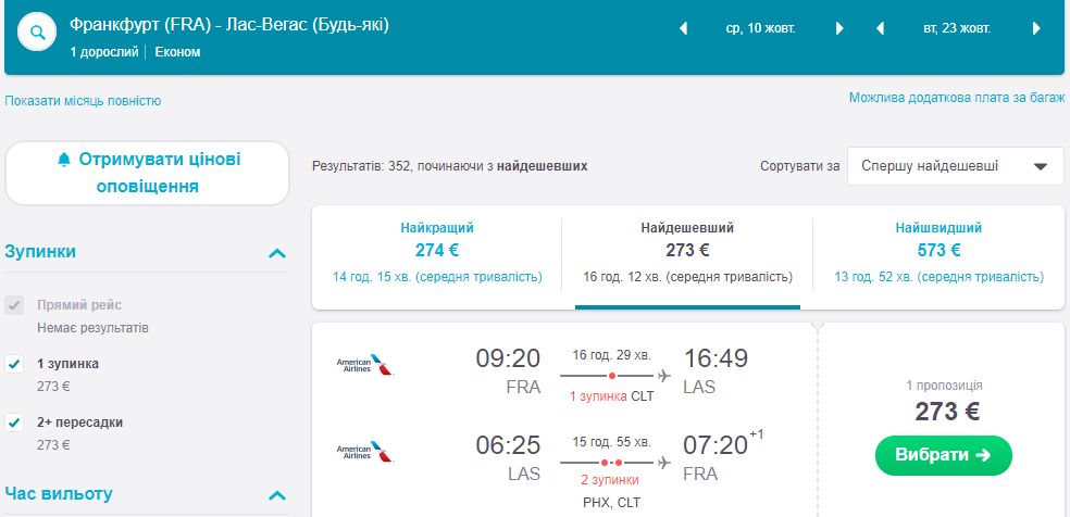 Франкфурт-на-Майні – Лас-Вегас, 10-23 жовтня (приліт 24 жовтня) – 273 євро (American Airlines). Переліт з персадкою у м. Шарлот.