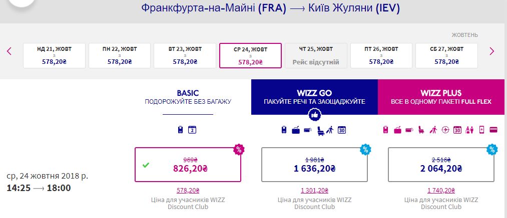 Київ – Франкфурт-на-Майні, 9-24 жовтня- 42 євро для учасників Wizz Club та 58 євро для інших пасажирів.