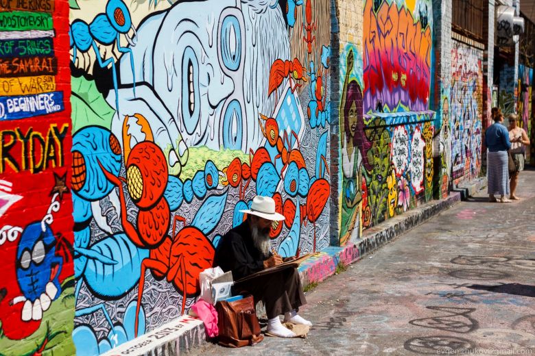 Местные граффити. Про местные уличные рисунки существует даже документальный фильм, который называется «Piece By Piece» – в нем рассказывается об истории граффити начиная с 80-х и заканчивая серединой двухтысячных. Одна из самых колоритных улиц Clarion Alley.